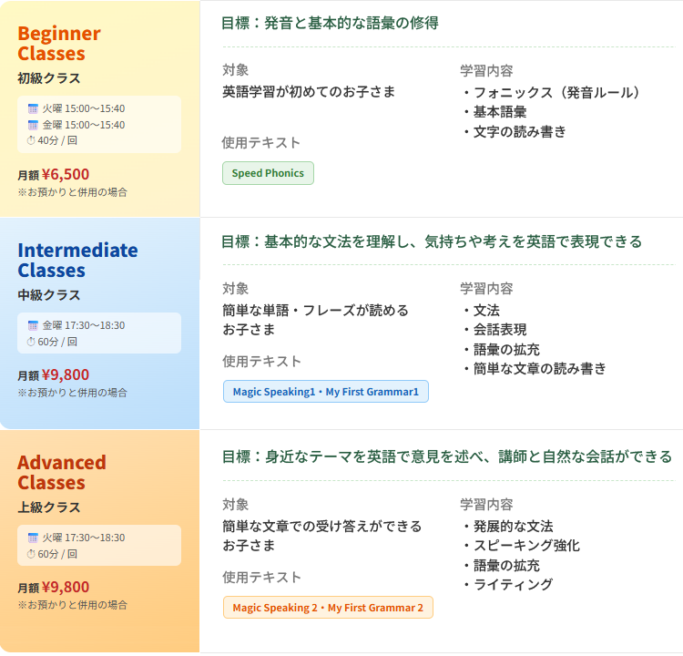 お子様の習熟度に合わせた3つのクラスをご用意しています。